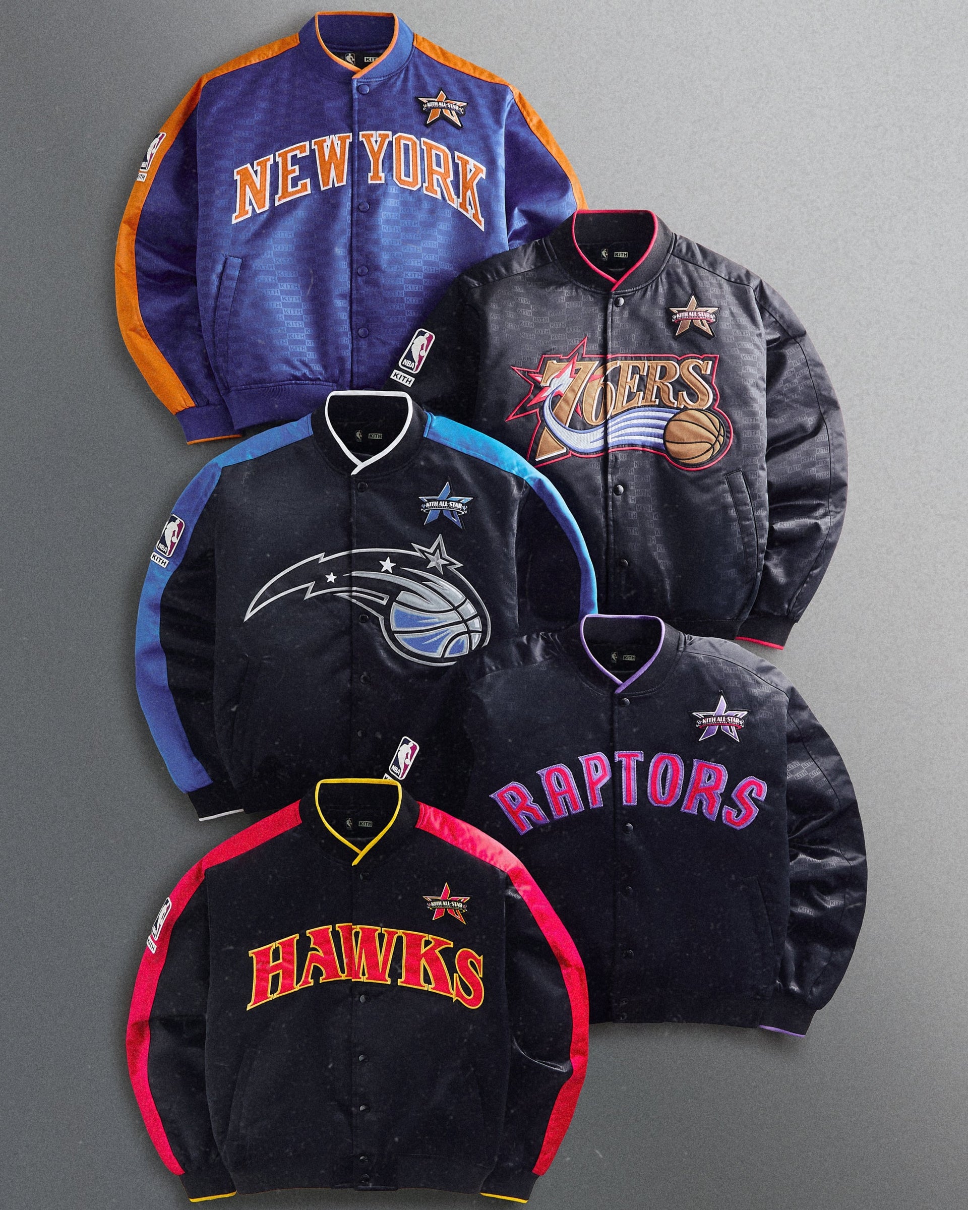 Kith Monogram Satin Bomber Jackets showcasing custom Hardwood Classics artwork, complemented by a premium Kith & AVIREX for NBA All-Star Leather Bomber Jacket.